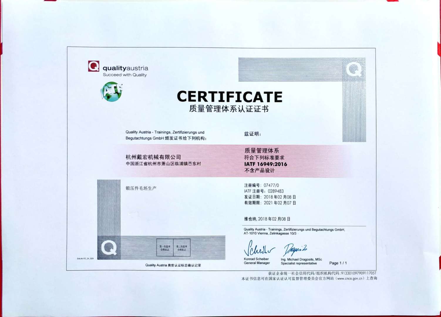公司通過了IATF16949:2016質量體系認證,產品執(zhí)行標準為GB12362,出廠產品能夠保證產品質量,能充分滿足用戶期望。